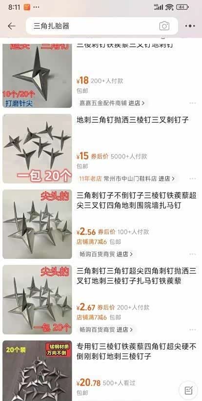先说这玩意儿。我在淘宝搜了,“三角扎胎器”,一堆链接,15块一包20个,还保密发货。卖家心里门儿清——这东西不能见光。宣传语更离谱:“随便撒,尖头自动朝上,专扎轮胎”。