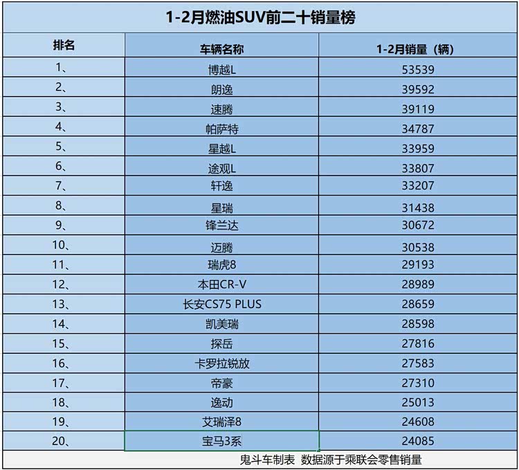日前,乘联会发布1-2月零售销量数据,鬼哥从1-2月燃油车零售销量前二十榜单上看到,共有十款燃油车累计零售销量过3万,这说明,这一细分市场,热销车型并不少。接下来看看具体车型排名与销量表现。