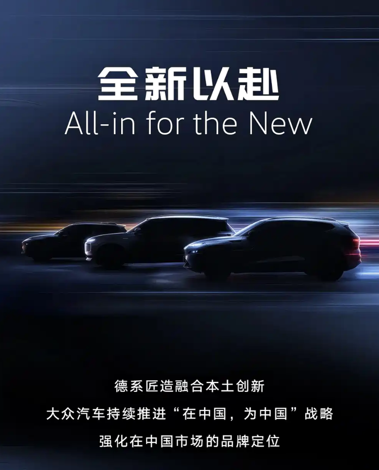 车家号·0浏览·2026-04-07 22:51 · 北京近日,大众官方发布预告,将于4月8日正式推出三款新能源产品。根据预告图,前两款车型分别为大众安徽旗下的与众08和上汽大众 ID.ERA 9X(参数|询价),第三款则是一汽-大众ID.AURA序列首款SUV。
