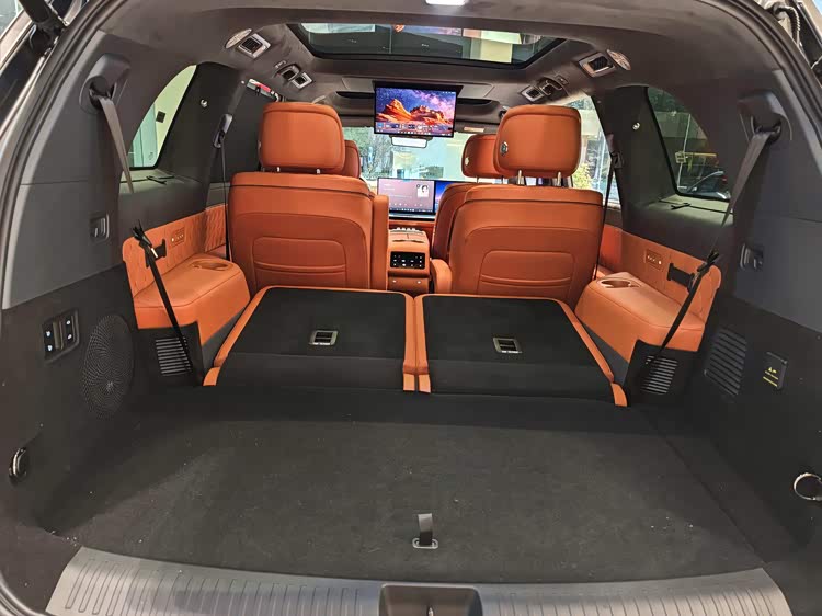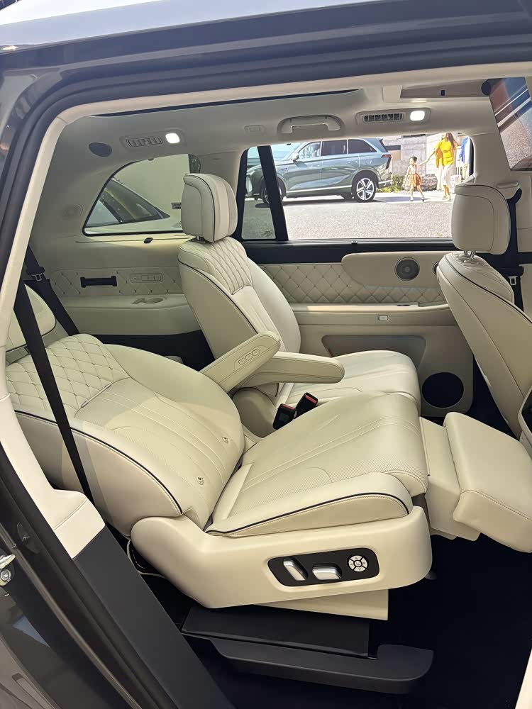 但我真正想说的不是它有多大,而是它大而不空。相比某些大型SUV来说,身撑得很开,进去一看,第三排是两个折叠小板凳,二排座椅也没什么配置,钱花在了外面。但V9X实车让我觉得,这台车是内外兼修的。它的二排右侧是带电动腿托的零重力座椅,通风加热22点按摩都有,头顶是21.4英寸4K吸顶娱乐屏,还有折叠小桌板。第三排有台式大扶手、绑带杯架,座椅支持电调加热和放倒,一二三排全有遮阳帘。说实话,这个三排配置我见过一些百万级别的车都未必给得这么完整。