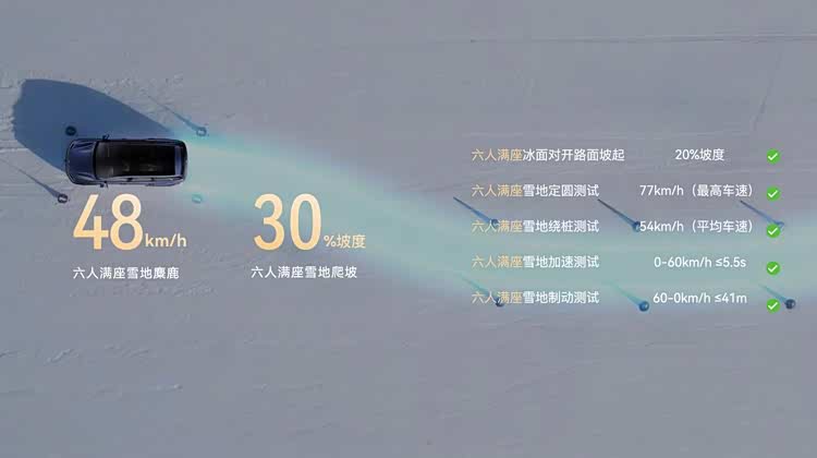 在雪地麋鹿测试中,华境S以六座满员状态跑出48km/h优异成绩,展现出强大的冰雪路面操控稳定性,全场景出行都从容。