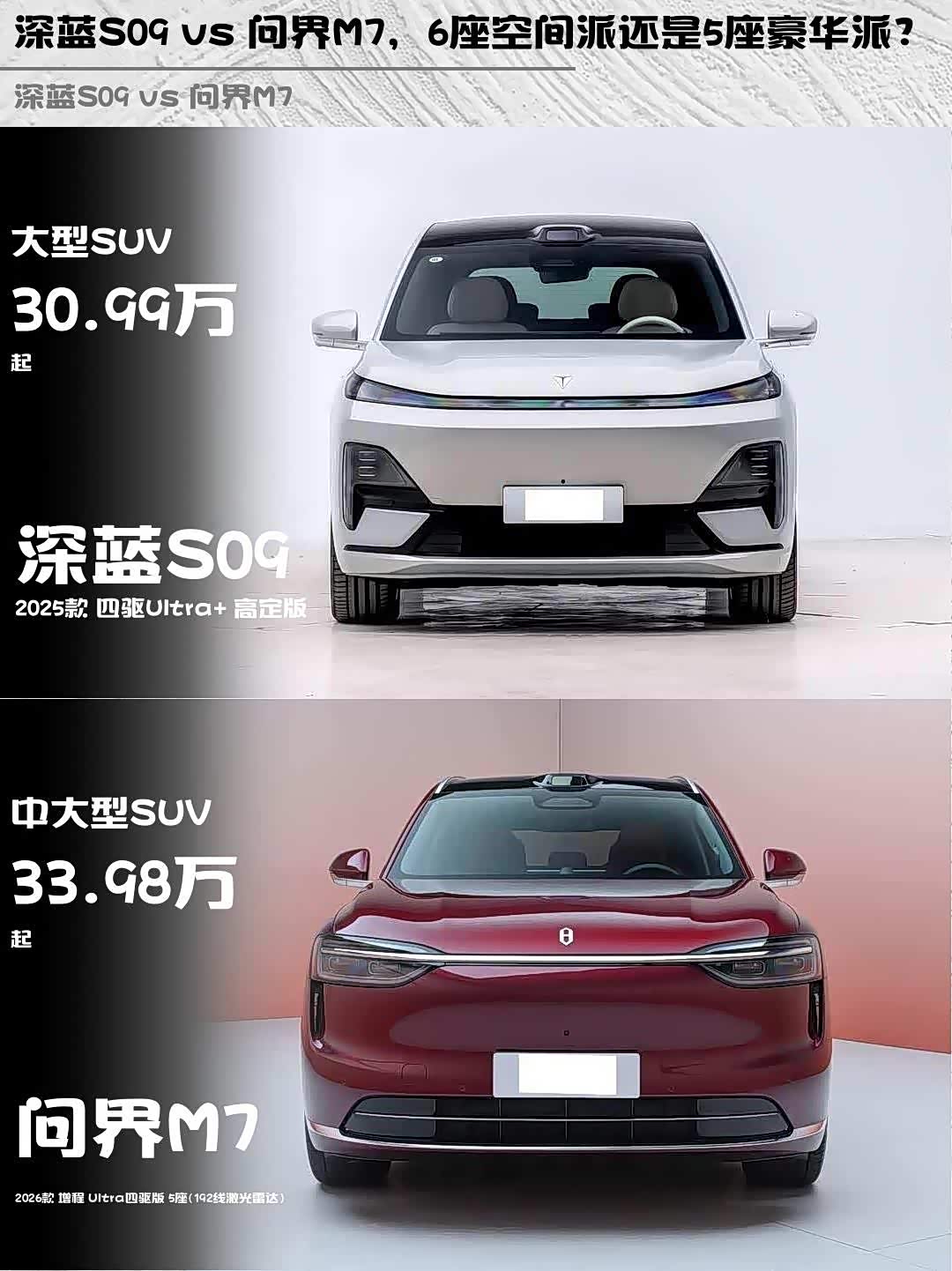 最近在选车的小伙伴看过来! 深蓝S09(参数|询价) 2025款四驱Ultra+高定版和问界M7 2026款增程Ultra四驱版这两台热门SUV,到底该怎么选?作为深度体验过两台车的“老司机”,来给大家盘一盘真实感受!🚗💨