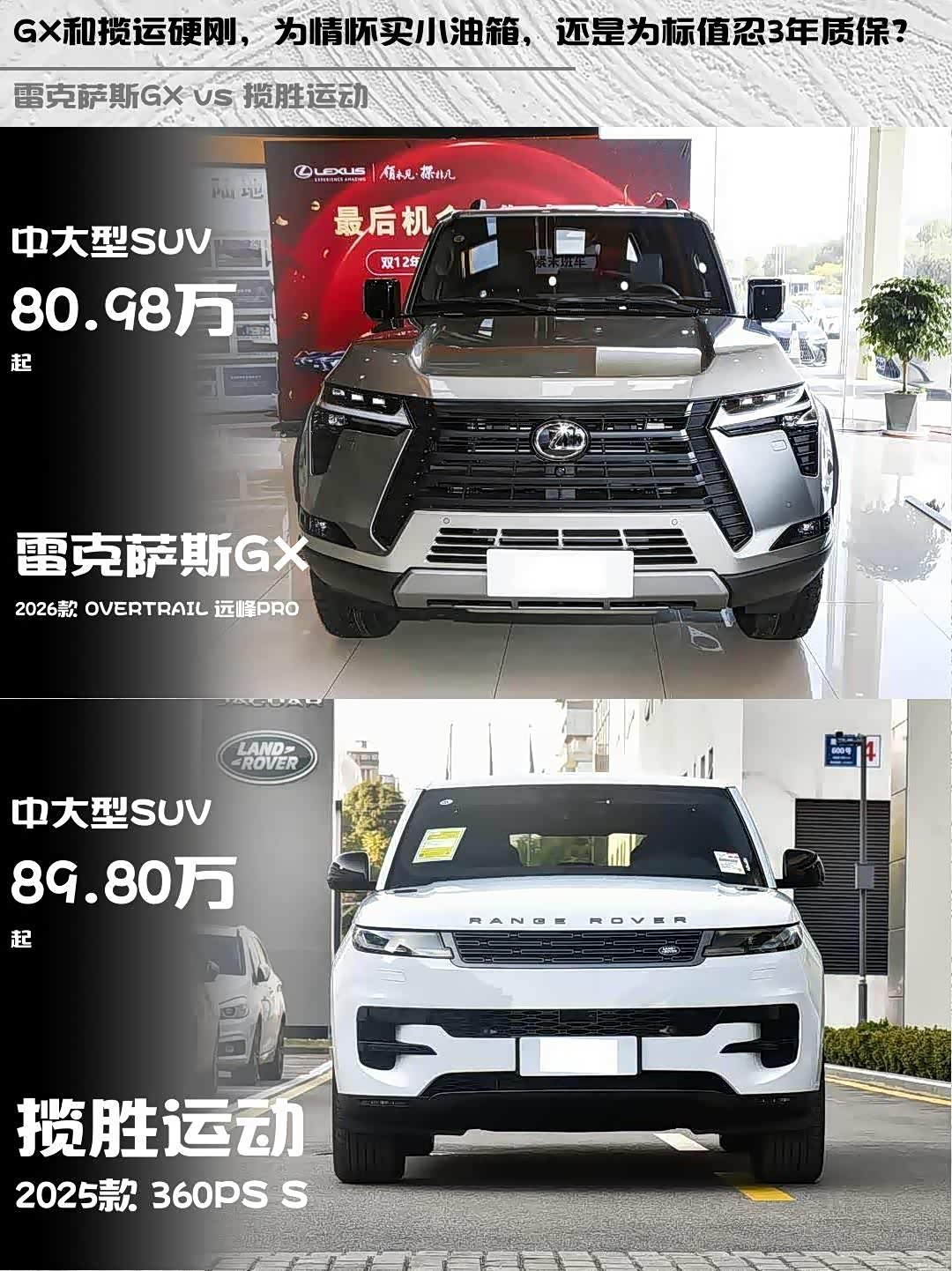 车家号·0浏览·2026-04-08 08:34 · 北京最近在纠结 雷克萨斯GX(参数|询价) 2026款 OVERTRAIL 远峰PRO和揽胜运动 2025款 360PS S的朋友看过来!这两台车我都试驾过,直接上干货对比👇