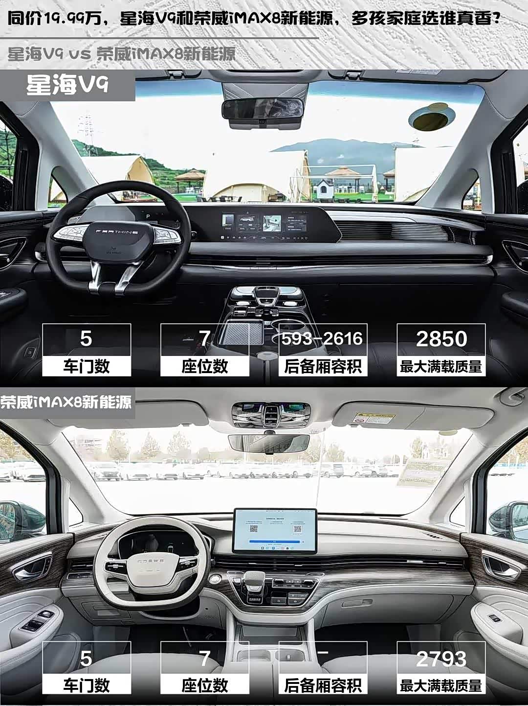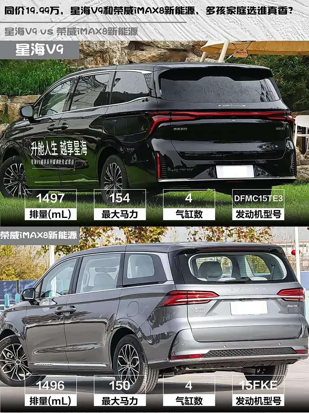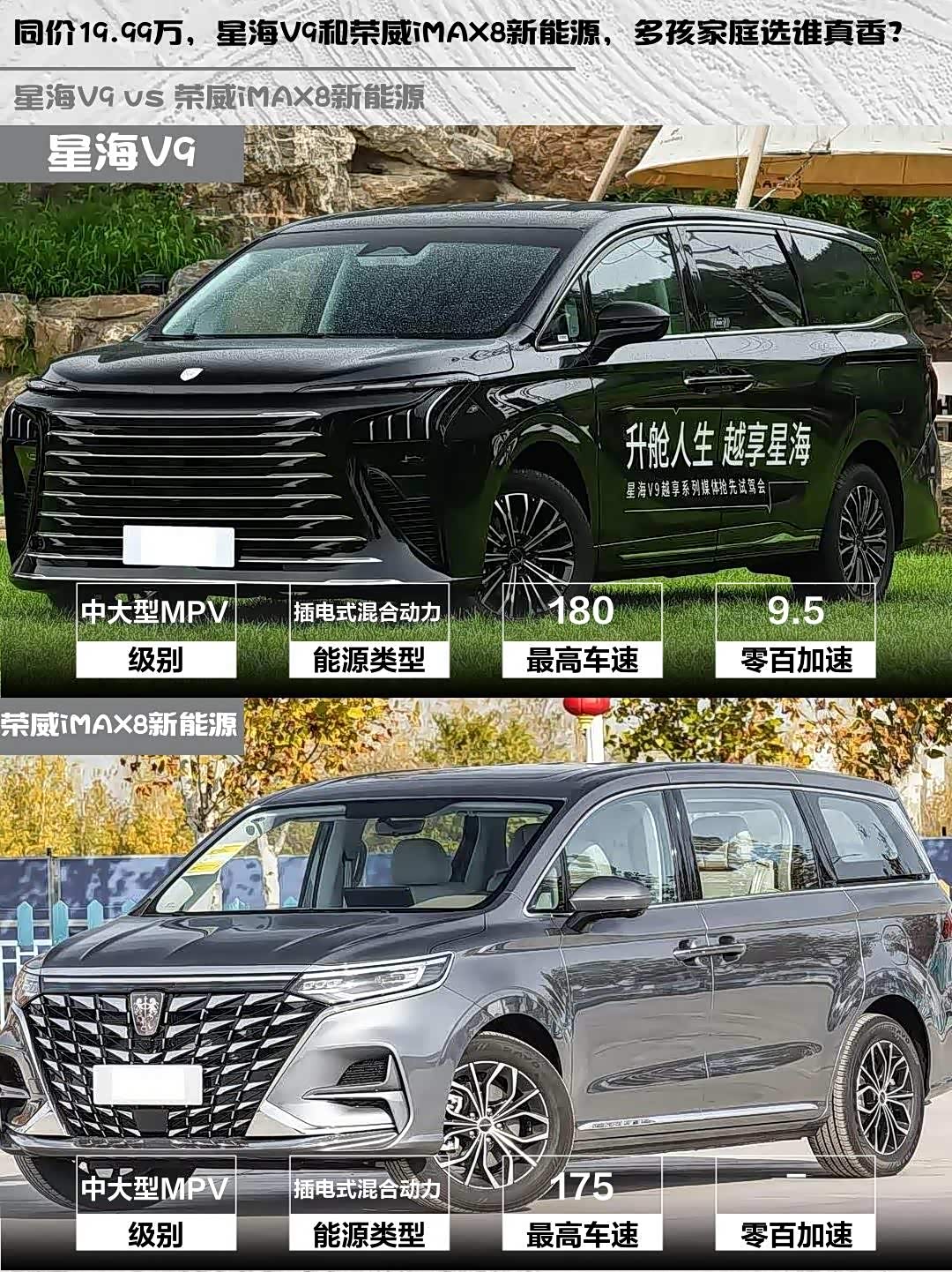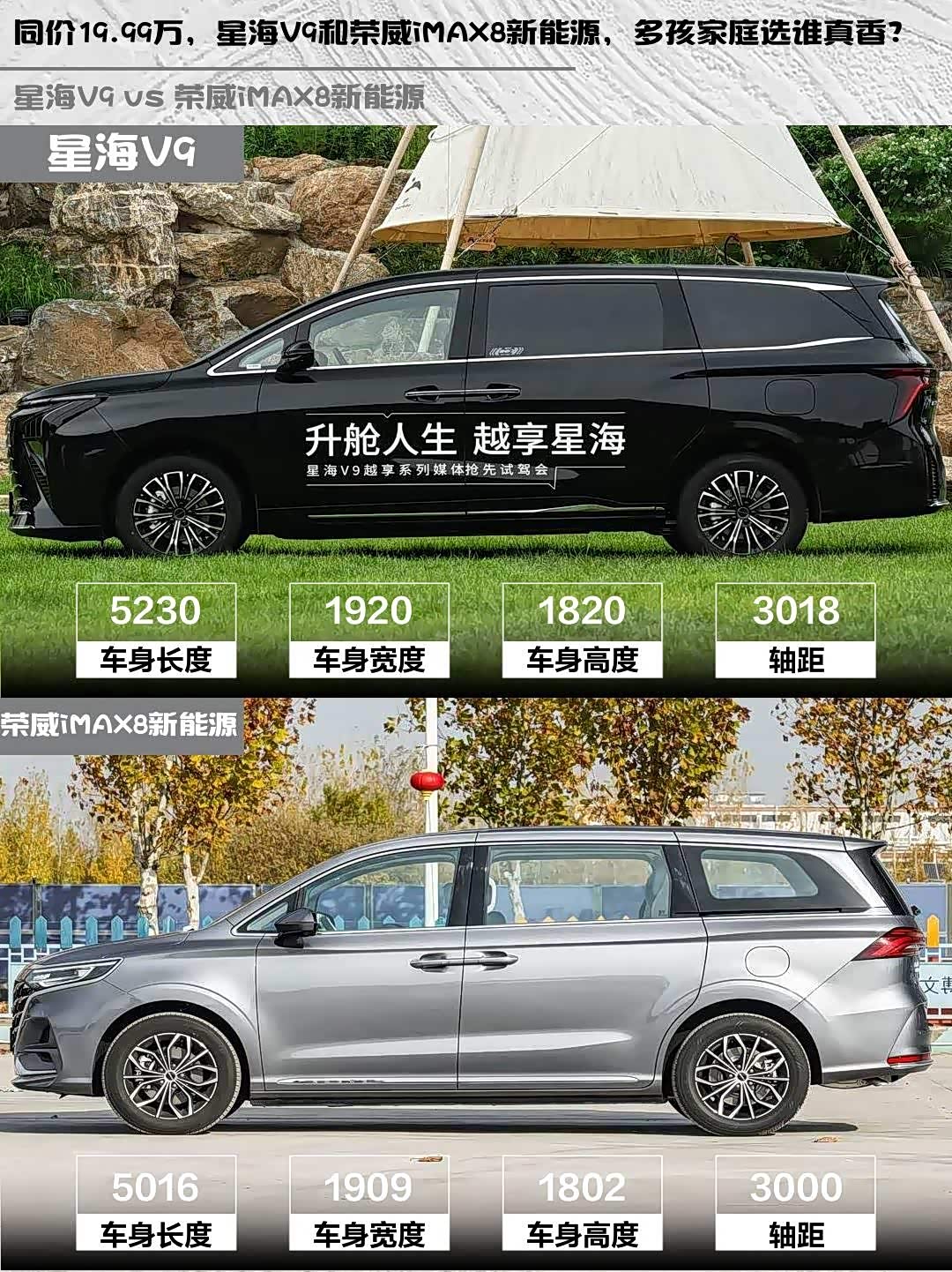 最近在帮朋友挑家用MPV,预算20万左右,新能源是刚需,重点对比了星海V9 2026款 越享系列 200km 豪华型和 荣威iMAX8新能源(参数|询价) 2025款 1.5T DMH 陆尊舒享版,两款车指导价都是19.99万,但细节差异挺有意思的👇