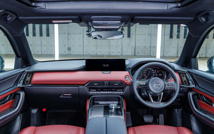 内饰部分,这次新增的Burgundy红色Nappa皮革套件,可以说是整台车最有“情绪价值”的地方。红色缝线贯穿方向盘与门板,加上金属饰件点缀,让CX-60在豪华与运动之间找到一个不错的平衡点。12.3寸全液晶仪表依旧是全车系标配,科技感维持在线。
