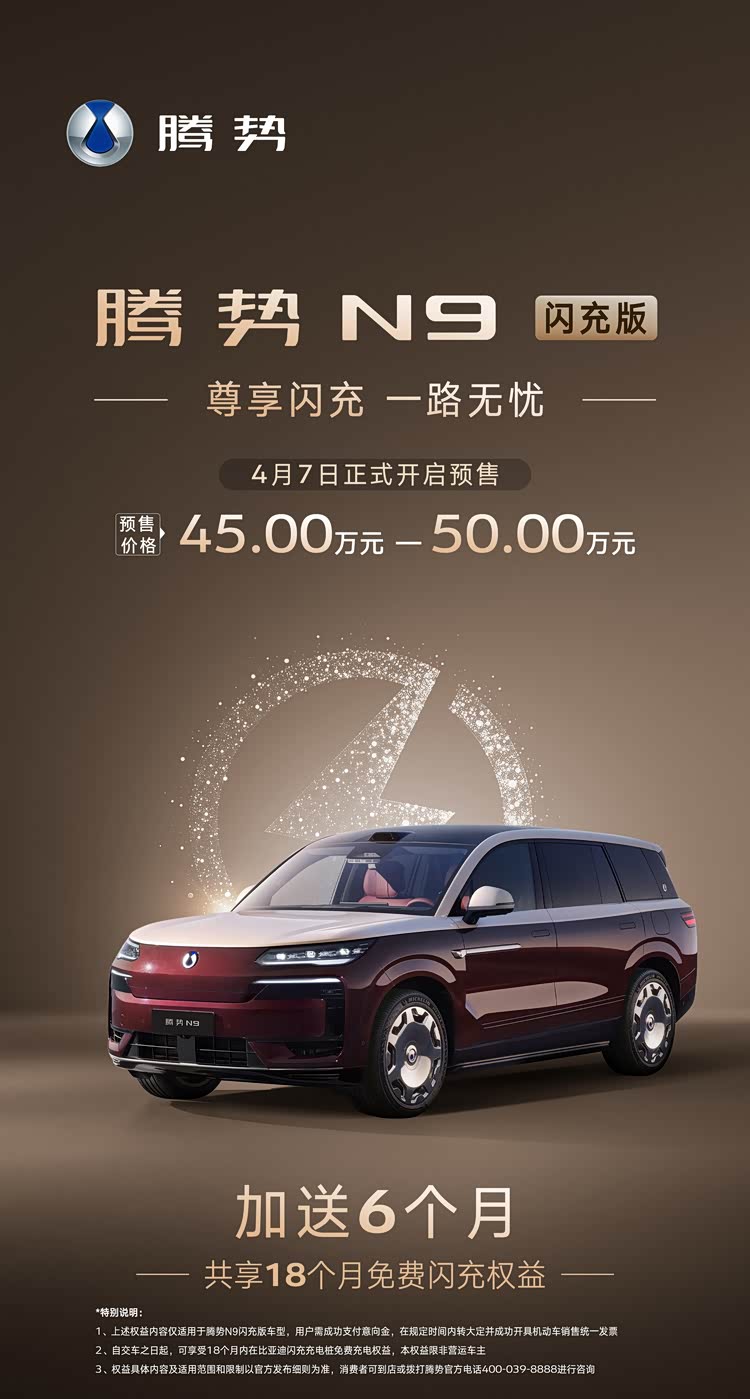 日前,腾势汽车官方宣布,旗下的 腾势N9(参数|询价)闪充版开启预售,官方预售价区间为45万元-50万元。相比老款车型,新车主要换装了比亚迪第二代刀片电池,同时升级了新一代AI智能座舱。