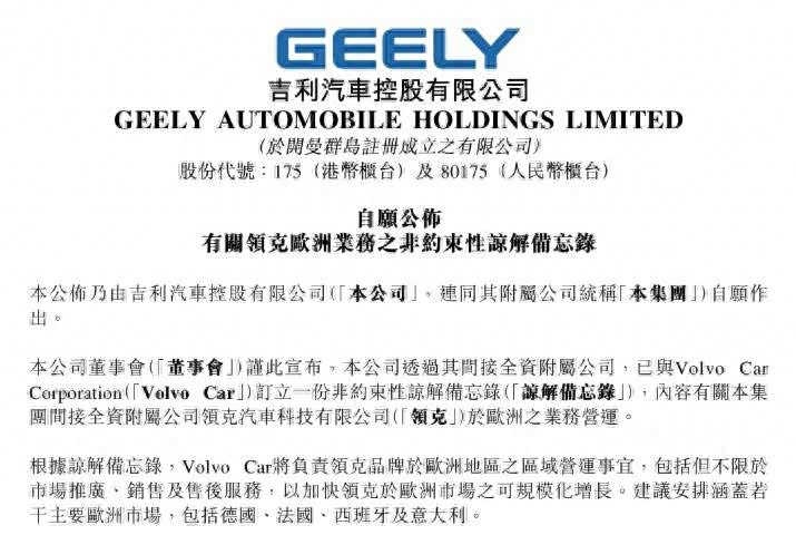 近日,吉利汽车发布公告,宣布已与沃尔沃汽车正式签署了一份非约束性谅解备忘录。根据该备忘录,沃尔沃汽车将全面接管领克品牌在欧洲地区的商业运营与品牌管理工作。值得注意的是,此次合作并不触及双方股权结构的任何变动,领克品牌将继续作为吉利汽车集团旗下的重要一员,保持其品牌独立性,并自主负责产品设计、研发以及全球合规认证等核心业务的开展。