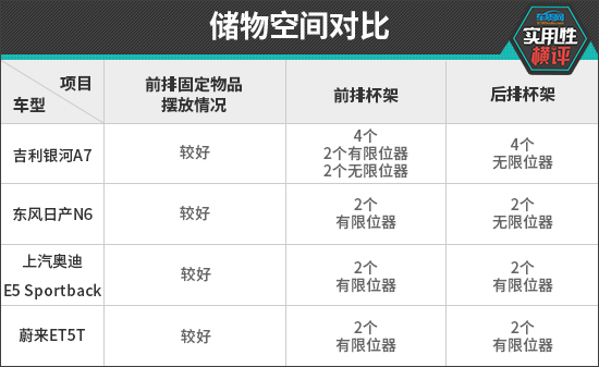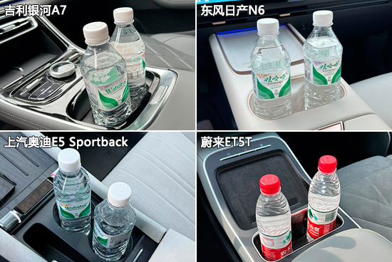 杯架测试中,吉利银河A7提供了8个杯架,在中型车中的表现十分出众,遗憾的是仅前排2个杯架配有限位器,对水杯或水瓶的固定能力较差。其余三款车型,均提供4个杯架,除东风日产N6后排无限位器外,另外两款车型的前、后排均有限位器。