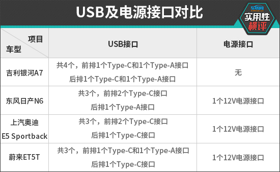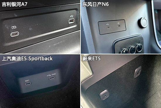 充电接口方面,吉利银河A7的USB接口数量最多且种类最丰富,达到4个,但它也是唯独没有配备电源接口的车型;其余三款车型均配备3个USB接口和1个12V电源接口。相比之下,上汽奥迪E5 Sportback的USB接口种类单一,均为Type-C接口。