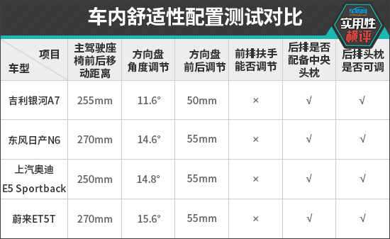 主驾驶座椅前后移动距离方面,东风日产N6和蔚来ET5T的测试数值达到270mm,并列第一。上汽奥迪E5 Sportback排名垫底,成绩为250mm。方向盘调节方面,蔚来ET5T的角度调节为15.6°,表现最佳;前后距离调节方面,东风日产N6、上汽 奥迪E5 Sportback(参数|询价)和蔚来ET5T的测试成绩均达到55mm,并列第一。反观吉利银河A7,两项测试成绩均不够理想,方向盘可调节范围较小。