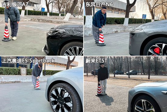 在外后视镜视野范围测试环节中,除上汽奥迪E5 Sportback采用电子外后视镜外,其余车型均为普通镜片外后视镜。测试数据方面,吉利银河A7和上汽奥迪E5 Sportback的左右外后视镜视野成绩均优于同级别车型测试均值,可为驾驶者提供更为宽阔的外后视镜视野。相比之下,东风日产N6的表现一般,特别是左侧外后视镜,测试成绩在四款车型中垫底,视野盲区偏大。