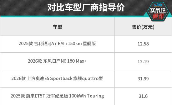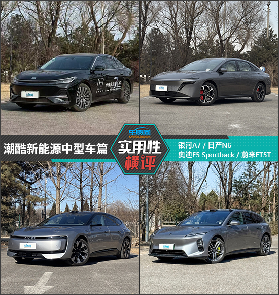 多年来,凭借良好的乘坐质感、空间表现,中型车一直备受广大消费者关注,新能源时代同样如此。面对琳琅满目的产品,年轻用户通常会以新潮、实用兼具视为首要需求。在往期的《日常实用性测试》中,我们曾测试过多款中型车。本次,我们将选取吉利银河A7、东风日产N6、上汽奥迪E5 Sportback和蔚来ET5T四款车型,通过横向对比,看看哪款车型的实用性表现更加出众。