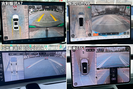在影像辅助系统方面,四款车型均配备360度全景影像和透明底盘/540度影像。经实测,四款车型画面清晰度以及畸变控制都较为不错,影像画面内都带有可随动转向的倒车辅助线,能够为驾驶员提供参考,实用性表现出色。