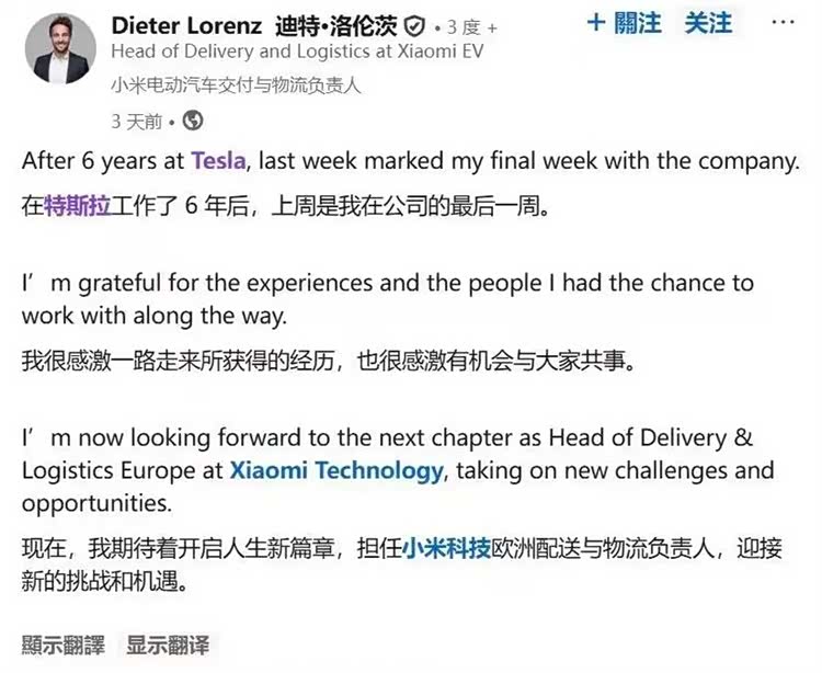 迪特·洛伦茨此前在社交媒体表示:“接下来我将开启全新篇章,加入小米科技并担任欧洲交付与物流负责人,迎接新的挑战与机遇。”