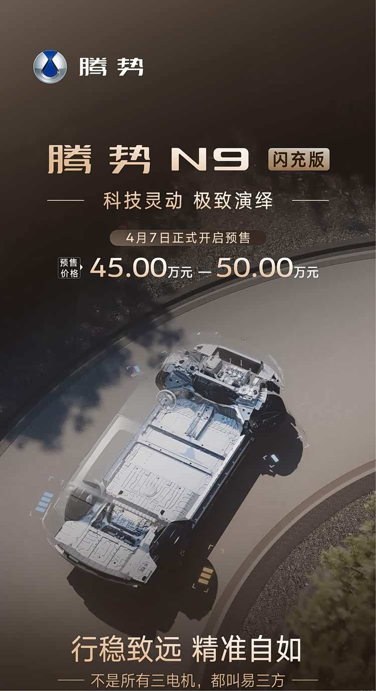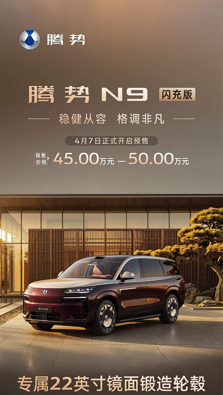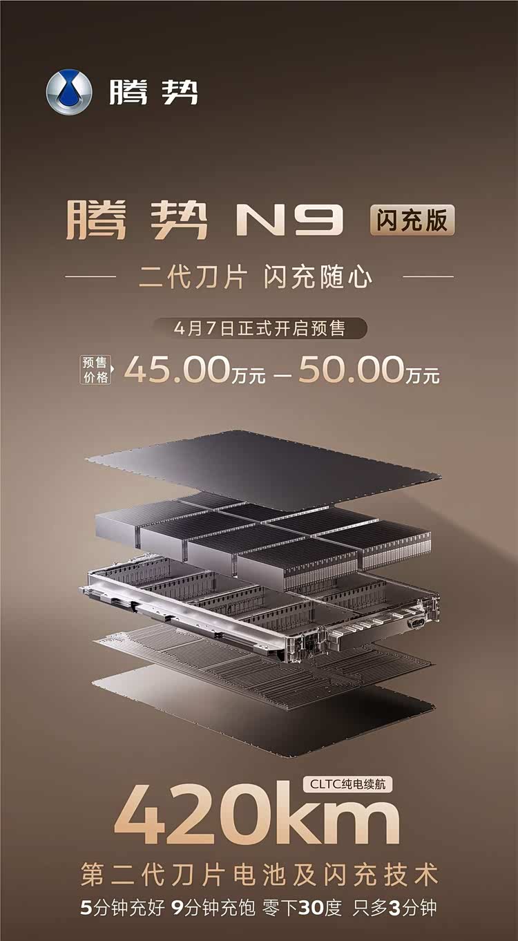 车家号·0浏览·2026-04-08 11:11 · 广东日前,腾势N9闪充版正式开启预售,新车预售区间为45.00-50.00万元。此次,新车主要是升级了二代刀片电池及闪充技术,CLTC纯电续航里程420公里。