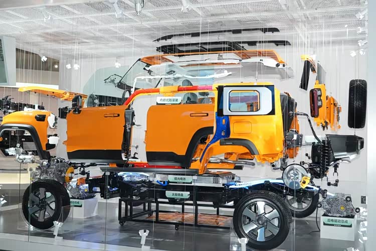 最令人印象深刻的是,BJ40增程一气呵成翻越了近100%坡度的双峰驼挑战,这背后是其非承载式车身——“带大梁”结构的硬核支撑。独立车架与大梁可承受高强度扭曲与冲击,抗扭刚性更强、耐久性更高,在交叉轴、炮弹坑等极端路况下车身不易变形。