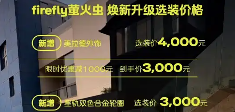 26款萤火虫在外观上的主要变化是新增了美拉德色(限时选装费为2000元),并且配备了全新样式的双色轮圈,更显时尚和活力。另外,增加了倒车下翻和记忆功能的外后视镜上,增加了智驾“小蓝灯”,可更醒目的提示其他车辆。