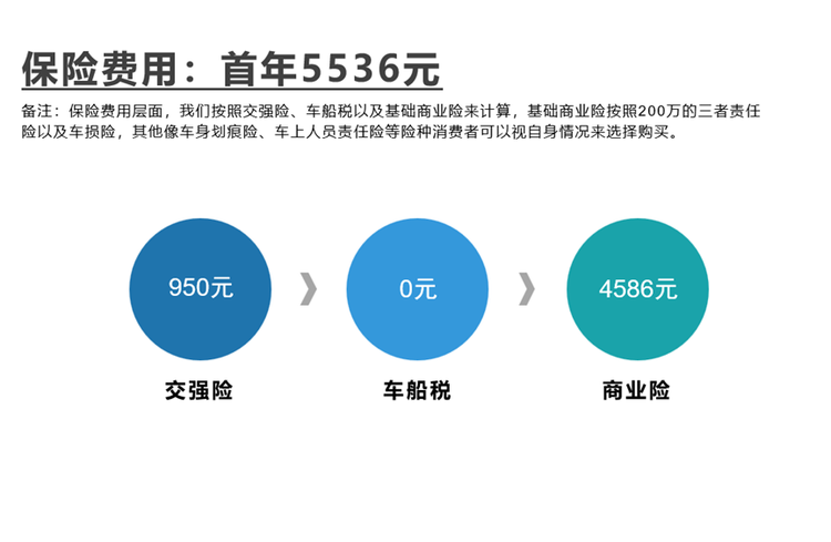 保险费用层面,我们主要计算交强险、车船税以及基础商业险这几个险种,其中基础商业险包含200万的三者责任险以及车损险,至于车身划痕险、车上人员责任险等额外险种,消费者可以视自身情况来选择购买。另外,此价格也不考虑之后几年不出险的折扣以及保险公司的优惠等。