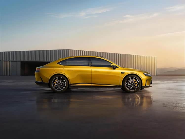车侧线条流畅舒展,经典溜背式轿跑轮廓搭配隐藏式门把手,风阻表现优异。车尾设计与车头呼应,贯穿式尾灯与内凹曲面融为一体,宽体轮眉与双拼色后保险杠强化了运动属性。最吸睛的是可电动升降的尾翼,开启后配合明黄色车身,运动氛围极强。此外,新车提供19英寸与20英寸两种运动轮圈可选。