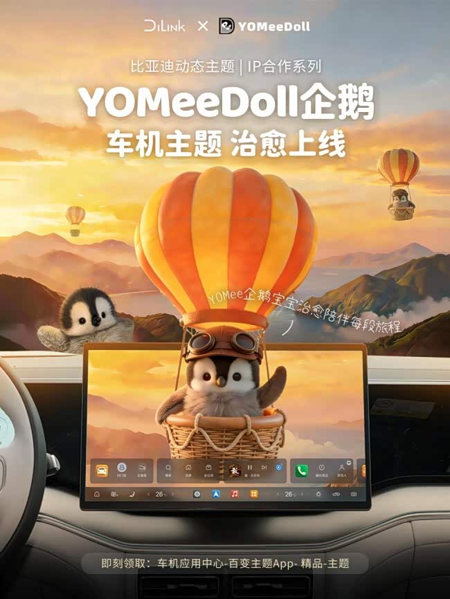 国产原创手作品牌YOMeeDoll企鹅曾通过微信表情包(累计发送量超20亿次),全平台二创(小红书话题浏览量突破5.6亿),成为Z世代"软物依赖"消费的代表符号。现在YOMeeDoll企鹅通过比亚迪生态开放平台正式入驻,双方共创车机主题。