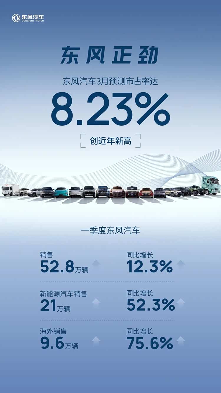 近日,东风汽车交出了2026年一季度的成绩单,累计销售52.8万辆,同比增长12.3%;新能源卖了21万辆,同比暴增52.3%;海外出口9.6万辆,同比大涨75.6%;3月市占率冲到8.23%,创近年新高。