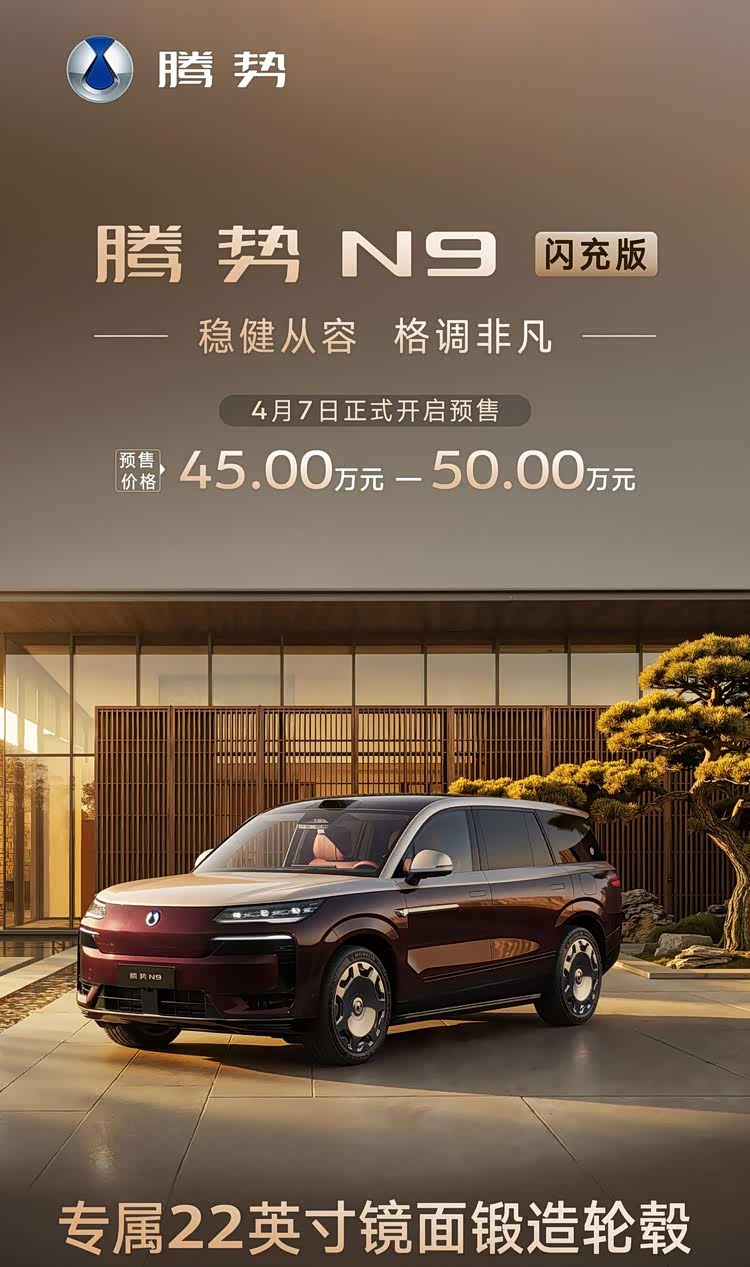 车家号·0浏览·2026-04-08 13:05 · 北京4月7日,腾势品牌宣布旗舰SUV——腾势N9闪充版正式开启预售,预售价区间为45万元-50万元。新车相比现款车型,换装了二代刀片电池,并采用比亚迪闪充技术,还配备了新一代AI智能座舱。