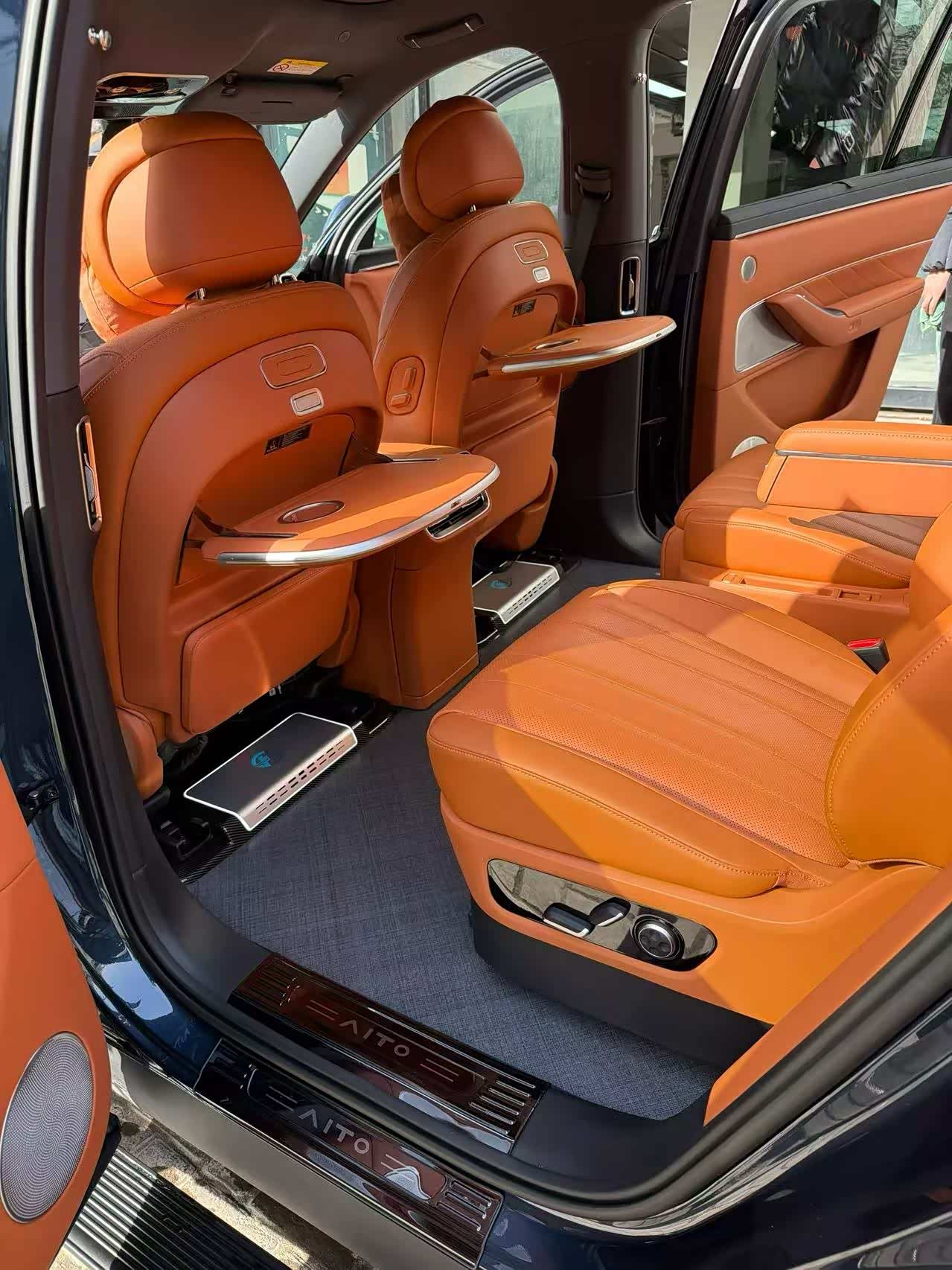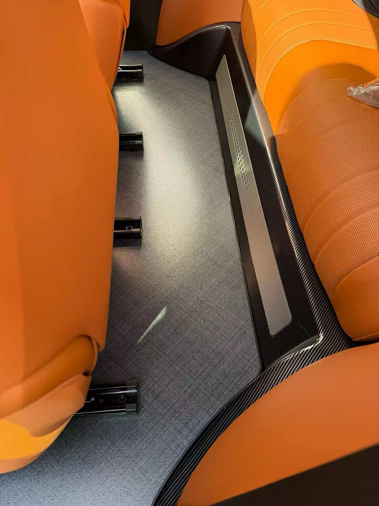 车门迎宾踏板采用亮面镀铬材质,镶嵌 “AITO” 专属品牌标识,每一次车门开启,都能彰显专属尊贵感,无论是商务接待还是日常出行,都能第一时间营造豪华氛围。车内地板采用定制化的灰色亚麻材质,表面平整细腻,脚感舒适,同时具备良好的隔音、防滑、防污性能,完美适配日常使用需求。地板边缘搭配碳纤维纹理装饰,与真皮座椅形成材质碰撞,进一步提升整车的精致感与运动气息。