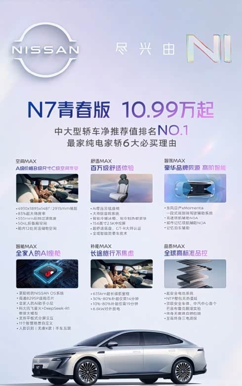 对比同价位车型,11-12万的预算通常只能买到紧凑级轿车,配置简陋且质保有限。而N7青春版不仅拥有A级车的价格,更提供了C级轿车的越级空间,驾乘舒适性与储物便利性大幅提升。其搭载的行业首个通过四针刺NTP整包无热蔓延实验的电池,从根源上解决了纯电车的安全顾虑。再加上东风日产合资品牌的高标准品控,使得这款车在空间、安全与品质上全面超越同级。