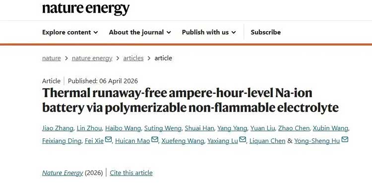 2026年4月6日,中国科学院物理研究所胡勇胜团队在《自然·能源》发表重磅成果:全球首次在安时级钠离子电池中彻底阻断热失控。他们开发出具有自保护功能的可聚合不燃电解质(PNE),当电池温度异常升高至150°C以上时,电解质会自动由液态固化为致密屏障,犹如在电池内部筑起一道“智能防火墙”,从根本上切断了热失控的传播路径。这一突破,不仅是钠离子电池领域的里程碑,更将重新定义全人类的电池安全标准。
