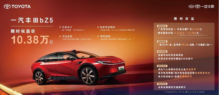 纯电车型bZ5:4月内置换补贴升级为不限品牌厂商补贴8000元,并可叠加9000元至14600元的国家置换补贴。以550 JOY版本为例,叠加厂补及国补后限时权益价为10.38万元。金融方面提供0首付3年0息、或低月供5年0息方案(置换与金融二选一)。购车赠送免费充电桩、500元电卡,非营运车主享三电终身质保及电池“三兜底”保障政策。4月购车额外获赠天窗遮阳帘。