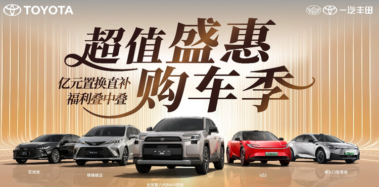 四月正值春季用车需求回升期,一汽丰田近期启动面向终端用户的购车优惠活动。本次促销以“亿元置换直补”为核心,覆盖旗下荣放、 卡罗拉(参数|询价)、亚洲龙、皇冠陆放、格瑞维亚、普拉多及纯电车型bZ5等主力产品线,并提供现金权益、置换补贴、金融方案、售后服务等多重叠加政策。活动有效期为2026年4月30日(含)前下定,部分车型需在5月31日前完成开票。