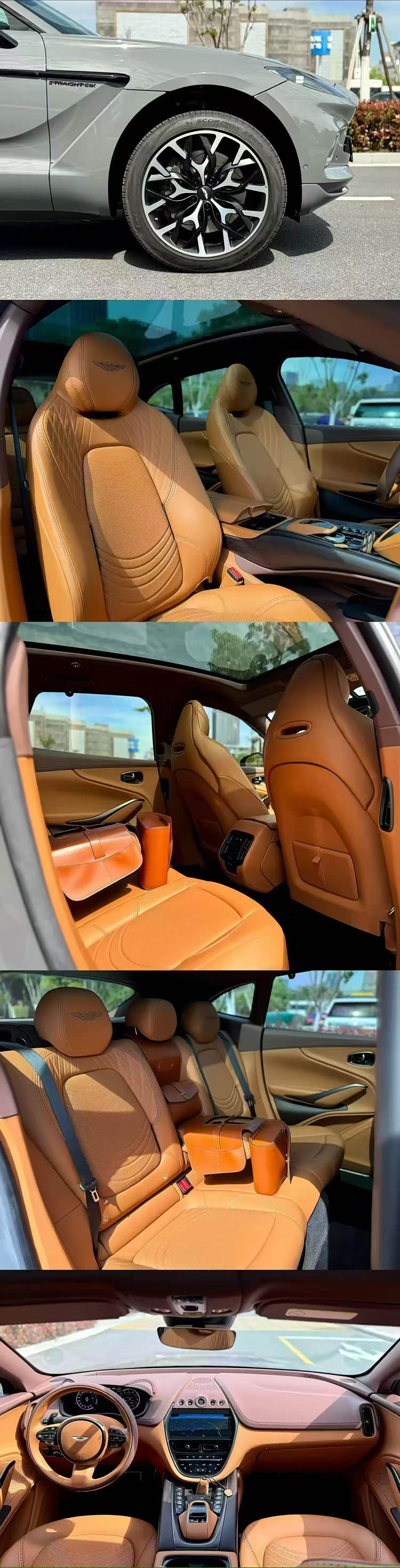 23年阿斯顿马丁DBX 灰色外观/棕色内饰, 配置:22寸熏黑轮毂,360环影,前后排座椅通风加热,车身同色底部包围,全景天幕等性价比