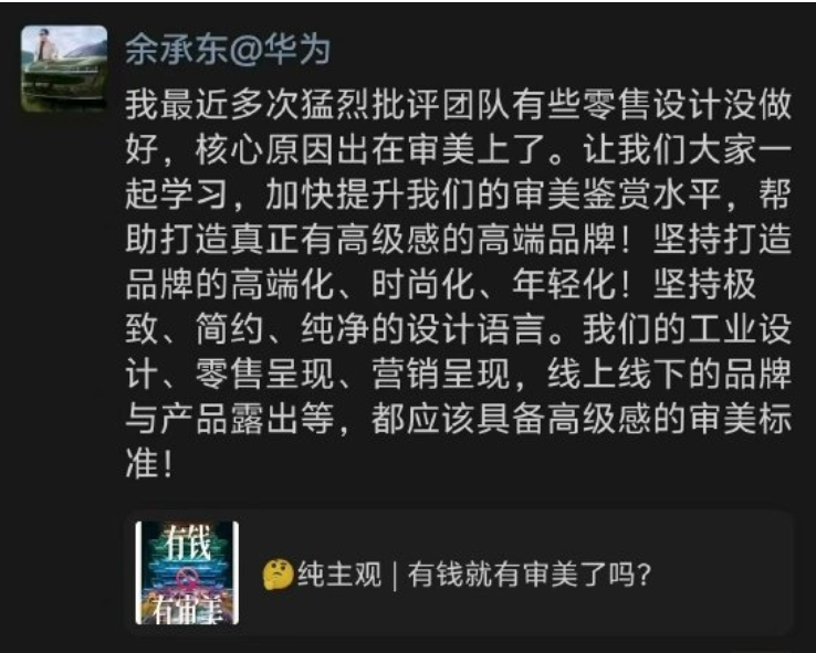 为了给团队“洗眼睛”,余总还在朋友圈转发了一篇名为《纯主观 | 有钱就有审美了吗?》的帖子。