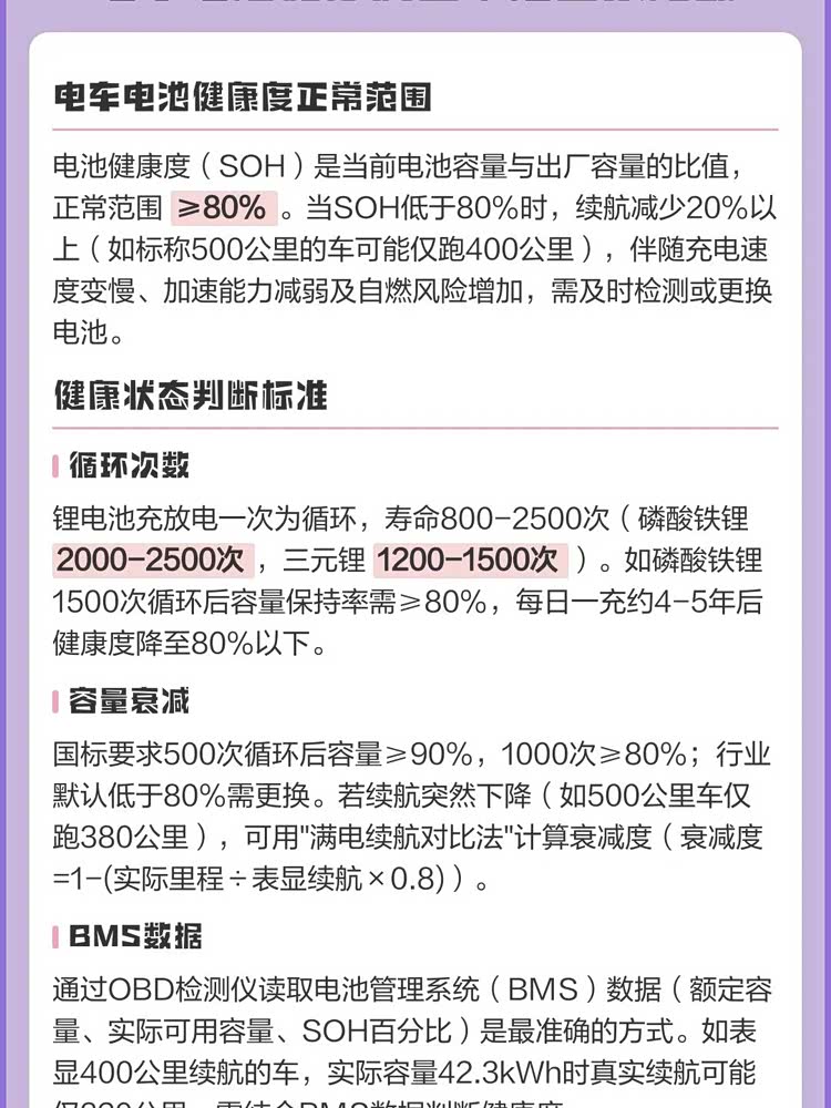 方法三:实路续航测试。这是一个最简单直接的验证方式。把车充到80%,记下表显续航里程,然后正常开一段路,对比实际行驶里程和表显消耗。如果实际跑50公里,表显却掉了80公里,甚至更多,那就说明电池的健康状况不太乐观了。