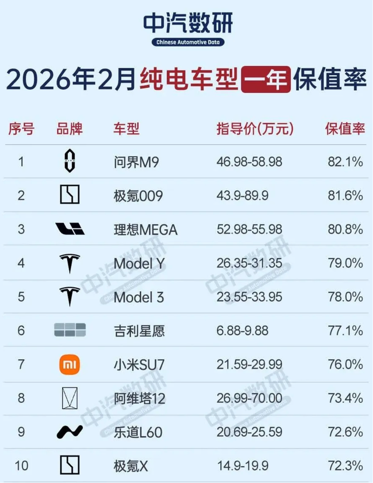 从2026年2月的最新数据来看,问界M9以82.1%的保值率排在首位,极氪009为81.6%,理想MEGA为80.8%,三款高端车型保值率均超过80%,与后续车型形成了较为明显的差距。