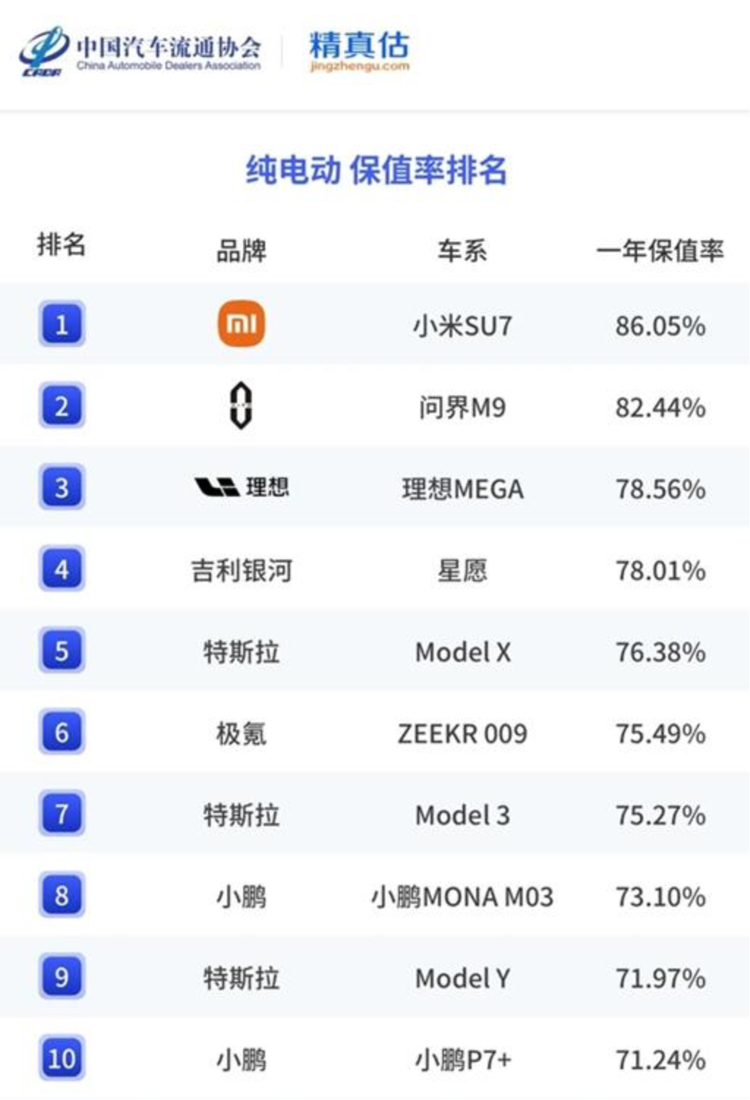 中国汽车流通协会与精真估联合发布的《2025年度中国汽车保值率报告》给出了答案——小米SU7以86.05%的一年保值率高居纯电车型榜首,问界M9和 理想MEGA(参数|询价)紧随其后,保值率分别达到82.44%和78.56%。