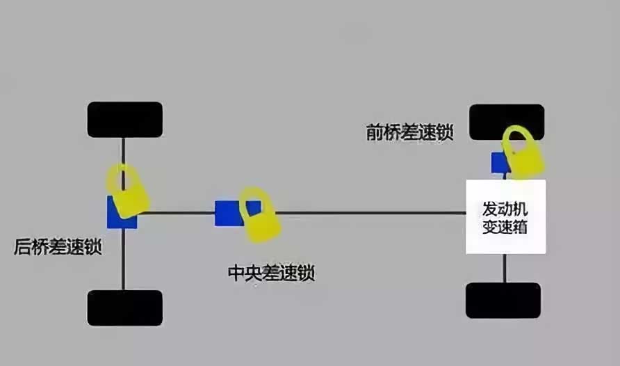 但对于全时四驱车型,必须先有中央差速锁,然后有前桥及后桥差速锁,这是最强脱困状态了,有了强大发动机及悬挂,这才是真正意义的越野车。如果没有中央差速锁,前后桥差速锁就意义不大了。