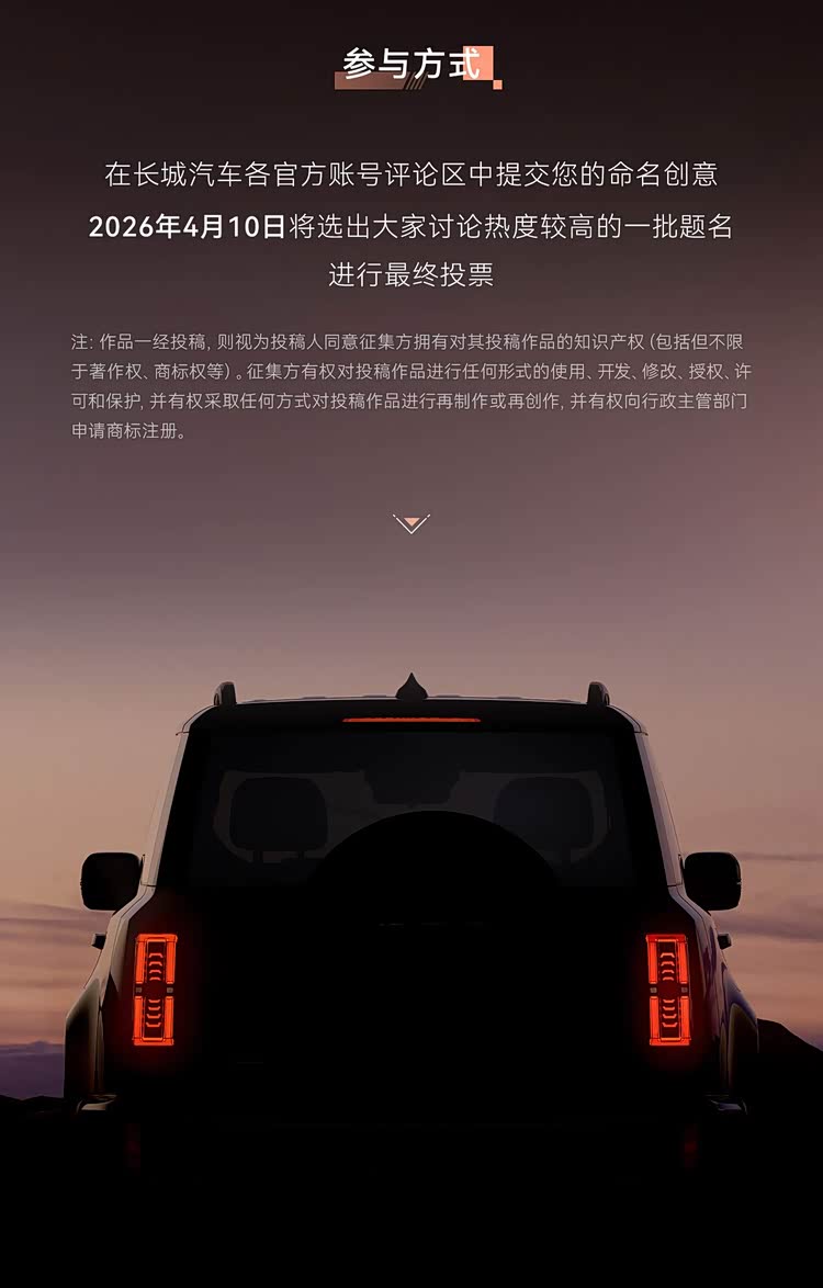 车家号·0浏览·2026-04-08 17:12此前我们发布过哈弗全新SUV的谍照,而在近日,该车的官图就来了。据悉,新车是首款归元平台旗舰“方盒子”SUV,目前该车也已开启征名,最终投票会在4月10日公布,喜欢的朋友可以多关注下。