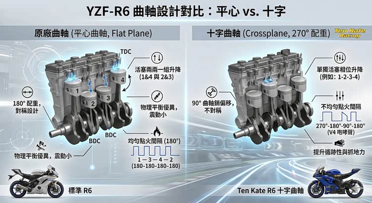 要将雅马哈著名的 Crossplane 十字曲轴哲学移植到 R6 身上,绝对不是把曲轴换掉这么简单,传统的并列四缸引擎采用平心曲轴,活塞两两一组,点火间隔是平均的 180 度,这让它在物理平衡上相对容易处理。