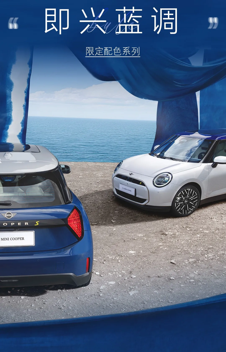 MINI官方把这套配色命名为"即兴蓝调",给出了两种双色渐变方案:白车身+渐变蓝车顶,或者蓝车身+渐变白车顶。官方文案里那句"万物青出于蓝,而关于蓝的想象永无边界",听着挺文艺,但我更感兴趣的是它背后藏着的产品逻辑。