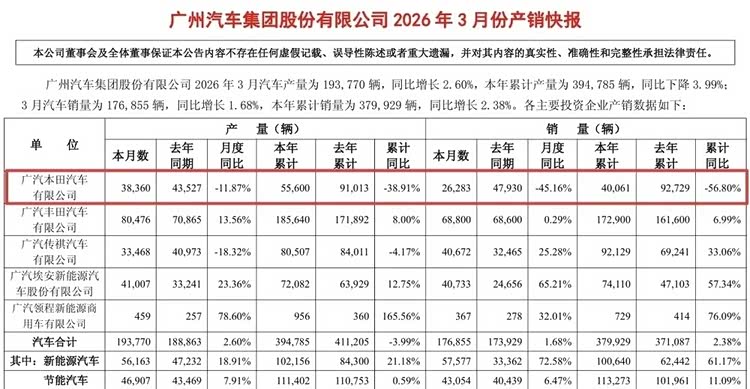 唯独广汽本田,成了集团里唯一的“拖油瓶”。3月仅售出26283台,同比暴跌45.16%,一季度累计销量40061台,直接腰斩式下滑56.8%。再看隔壁广汽丰田,3月近7万的销量、一季度超17万的成绩,把广本甩得连车尾都看不见,曾经平起平坐的两大合资兄弟,如今差距大到让人唏嘘。