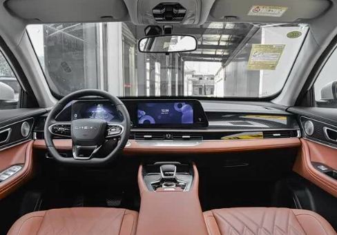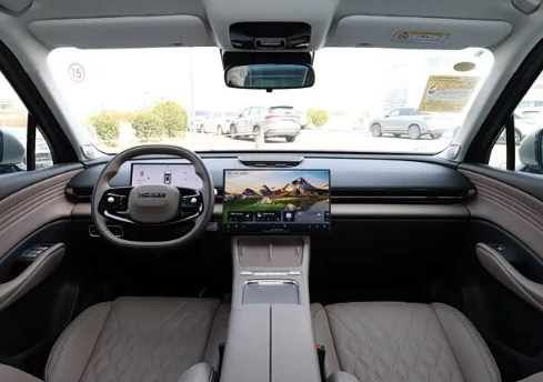 新车内饰采用环抱式座舱设计,大面积软包材质,中央配备可左右滑动的15.6英寸悬浮式中控屏,内置8155芯片,车内还配备无线充电面板和256色音律氛围灯。副驾驶席配备零重力座椅,同时前排座椅支持加热、通风和按摩等功能。