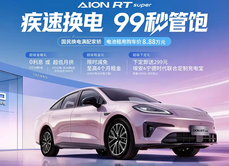 日前,广汽埃安 AION RT(参数|询价)换电版正式上市,该车命名为RT super,电池租用购车售价为8.88万元。从产品定位来看,它并非简单增加配置的衍生车型,而是围绕补能效率与使用成本进行重新设计的一种解决方案。