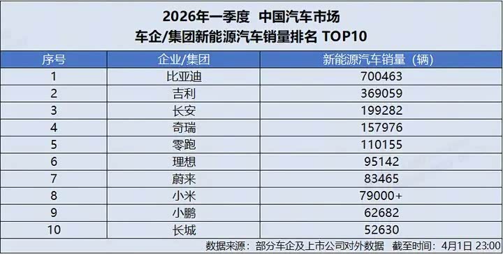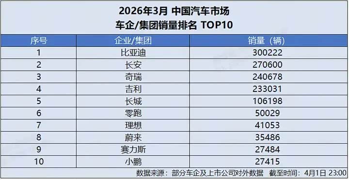 车家号·0浏览·2026-04-08 20:50 · 重庆4 月 1 日,比亚迪发布 2026 年 3 月产销数据,单月总销量达300222 辆,强势突破 30 万辆大关,再添荣耀战绩,斩获中国车企销量冠军,并连续 58 个月蝉联中国新能源汽车销量冠军,持续稳固行业龙头地位。截至目前,比亚迪新能源汽车累计销量已超1580 万辆,一季度累计销售 700463 辆,以硬核数据印证技术与规模双重实力。