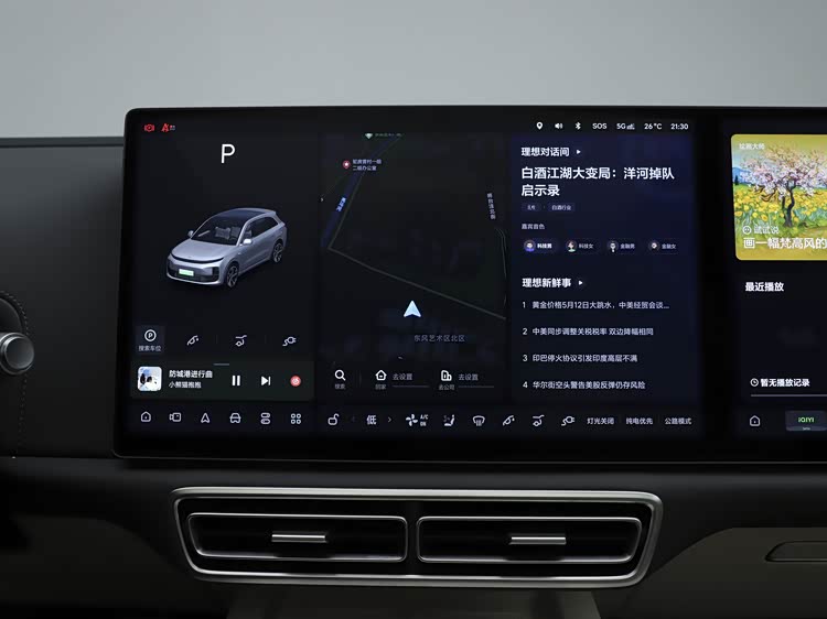 虽然都是家用SUV,但两台车在内饰部分还是走了不同的路线,咱们先从布局说起。东风日产NX8的内饰布局主打温馨居家风,整体设计偏规整,中控台线条柔和,按键布局清晰,没有过多复杂的装饰,看着就很舒服,很符合家用车的调性,哪怕是新手也能快速找到各项功能的位置。理想L6的内饰布局则更偏向实用简约,中控台设计简洁大气,以大尺寸双联屏为核心,物理按键很少,大部分功能都集中在屏幕上,整体视觉上更简洁,给人一种干练的感觉。