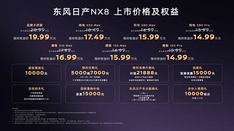 上市权益八重礼同步公布,包括超级置换礼:4月30日前下订直减10000元,叠加优惠后,东风日产NX8上市限时权益价为14.99-17.49万元;限时定购礼:4月12日前支付5000元定金可抵7000元;限时免费升舱礼:免费赠送后排133°电动大躺椅、全遮光电动遮阳帘、墨海蓝外观色;选装礼:零压舒享套装、全景视听套装、时尚光幕套装,限时超低价;以及无忧用车礼、国家置换补贴、东风日产车主复购礼、合伙人推荐礼等。
