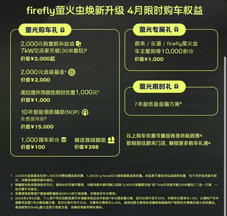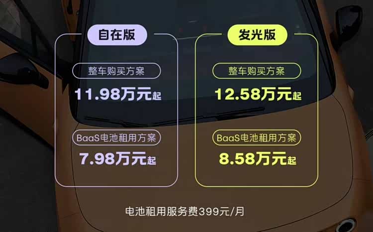 4 月 7 日,新款萤火虫正式上市,售价区间为 11.98-12.58 万。 BaaS租电方案售价 7.98 万元起,租用服务费 399 元/月。