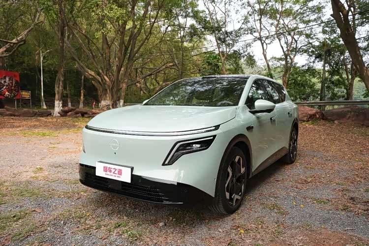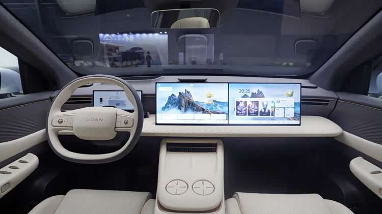 内饰方面,环抱式座舱,提供米白、雅黑两种内饰配色,256色光瀑式氛围灯与水波纹门饰板结合为一体,双辐式多功能方向盘搭配电子怀挡,前排配备10.25英寸仪表盘+双15.6英寸连屏设计+63英寸AR HUD抬头显示,内置NISSAN OS 2.0、高通8295P芯片、四音区智能语音。