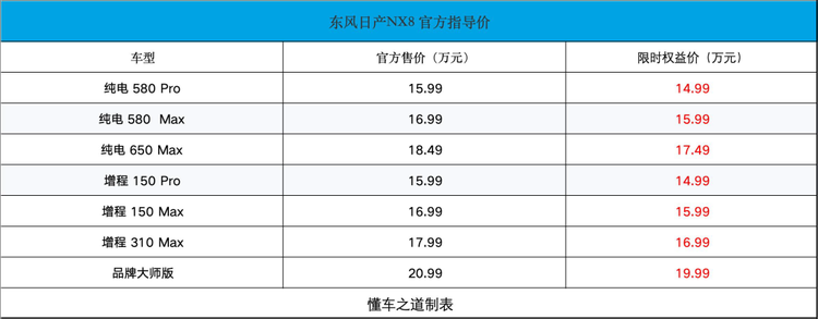 【懂车之道产品】近日,懂车之道获悉,广州·白云,4月8日,我们从官方获悉,东风 日产NX8(参数|询价)正式发布上市,共推出7款车型,官方指导价15.99-18.49万元,限时权益价14.99-17.49万元。此外,官方还推出了NX8品牌大师版,官方指导价20.99万元,限时权益价19.99万元。下面,和大家一起来看看新车的产品力如何?
