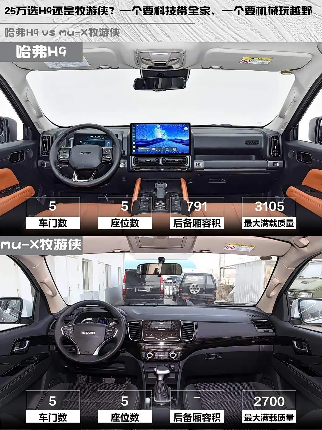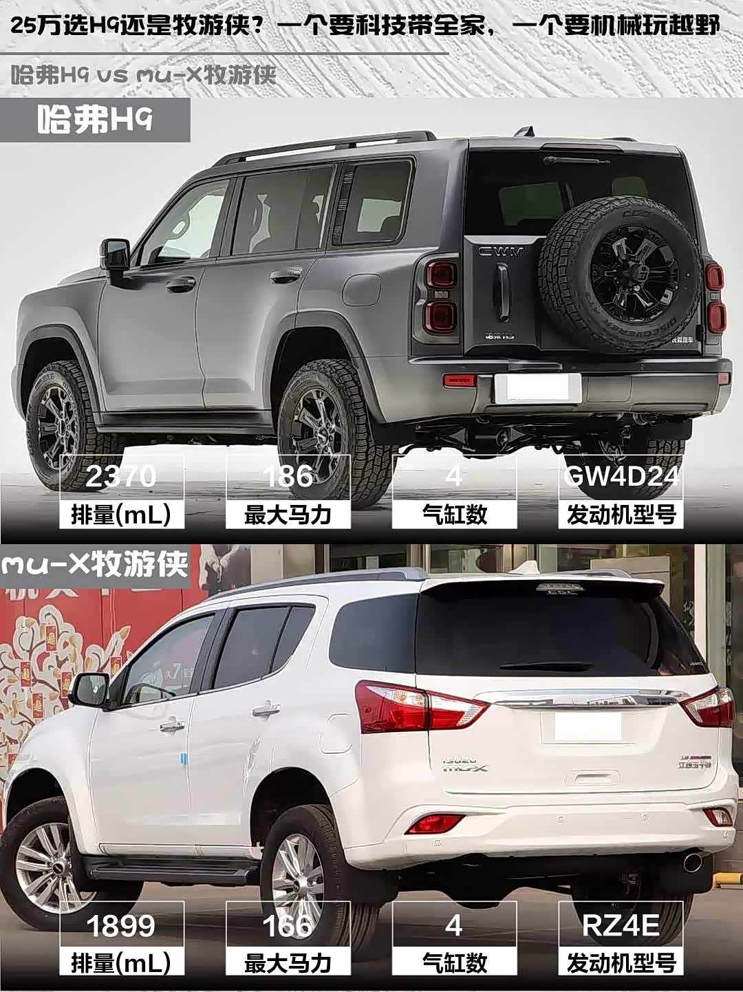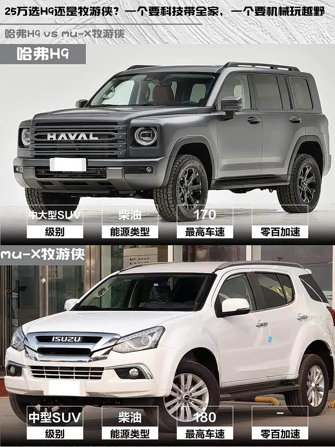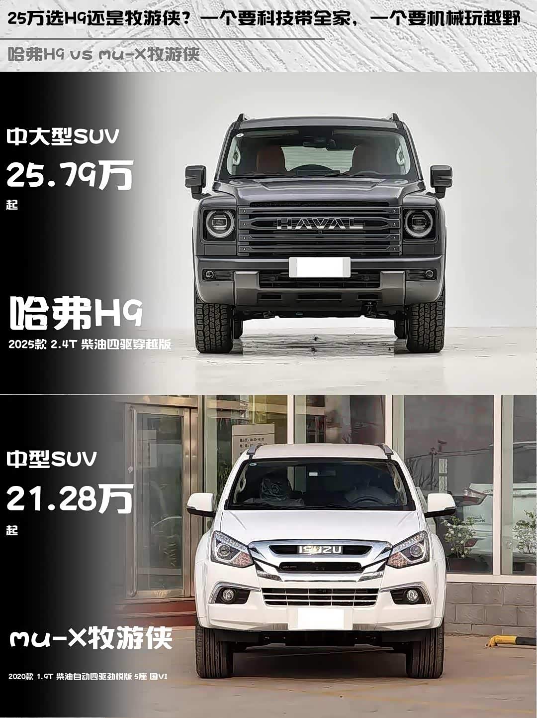 最近被柴油硬派SUV种草了!😍 对比了哈弗H9 2025款 2.4T柴油四驱穿越版和 mu-X牧游侠(参数|询价)2020款1.9T柴油自动四驱劲悦版,发现两款车性格差异还挺明显的,分享下我的真实感受👇